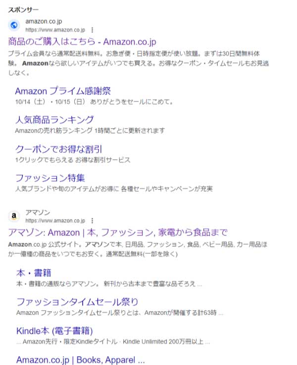下の画像はgoogle検索結果で表示されたアマゾンの偽サイトです。上のスポンサーが偽物になります。